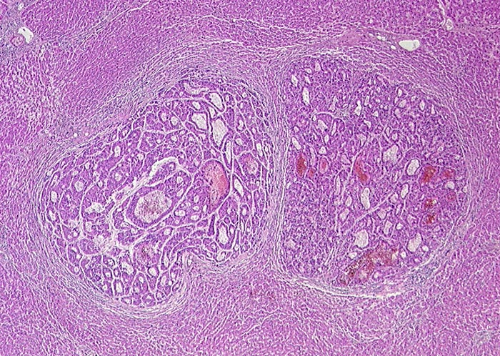 Das Tumorgewebe in der Bildmitte ist diskret basophiler als das umgebende Leberparenchym. Leberzellähnliches Gewebe aus doppel- oder mehrreihigen Zellplatten. Diese bilden pseudoglanduläre Strukturen aus.