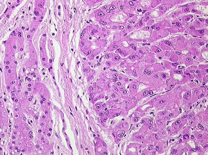 Das Tumorgewebe rechts unterscheidet sich von der normalen Leber links durch die Mehrreihigkeit der Zellplatten und vergrösserte Kerne mit prominenten Nukleolen. Der Tumor wächst expansiv und drängt das angrenzende Leberparenchym zur Seite.