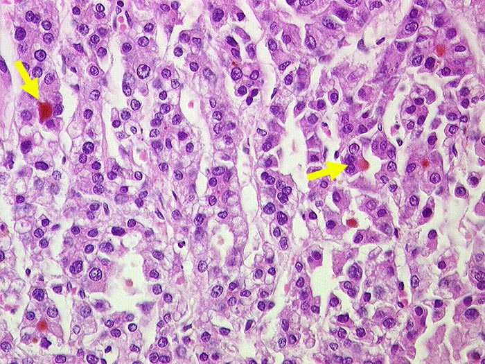 Trabekulär aufgebautes Tumorgewebe. Pseudoglanduläre Anordnung der Tumorzellen um einen zentralen ► Gallepfropf. Die Tumorzellen zeigen deutlich vergrösserte Kerne mit Verschiebung der Kern-Zytoplasmarelation zu Gunsten des Kerns. Ein Teil der Tumorzellen hat klares Zytoplasma.