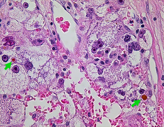 Tumorzellen mit reichlich vesikulärem Zytoplasma. Geringe ► Gallebildung.