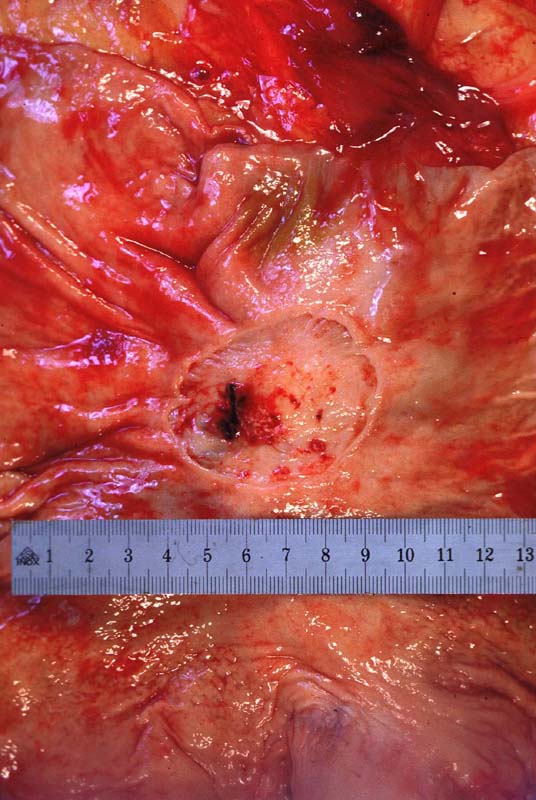 PathoPic ID 1239 - Ulkus mit arrodierter Arterie im Ulkusgrund : massive Ulkusblutung