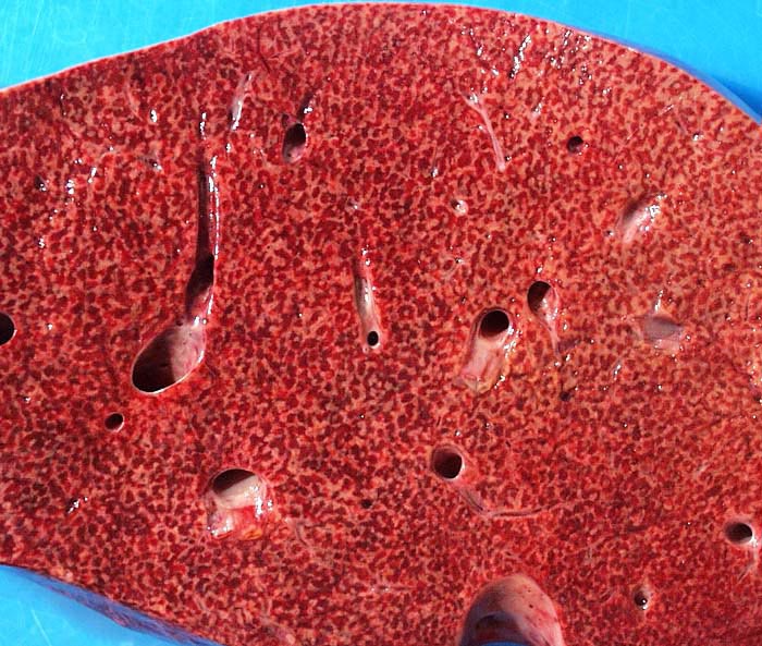 Gelb gefärbt ist das erhaltene Leberparenchym in den Zonen 1 und 2. Rot sind die mit Blut gefüllten perivenulären Nekrosezonen.