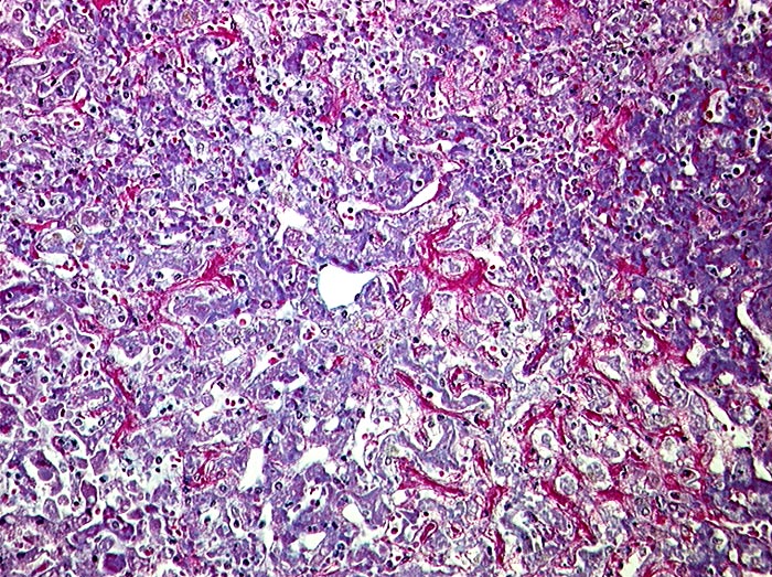 Znetralvene in der Mitte des Bildes. Die perivenulären Sinusoide sind prall gefüllt mit Blut. Die Leberzellbalken sind leicht verdünnt (druckatroph). Keine Fibrose.