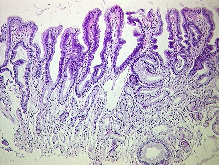 Die Foveolae sind korkenzieherartig gewunden und sind stellenweise länger als 50% der Schleimhautdicke. Das Epithel ist basophiler als normal (regeneratorische Veränderung).