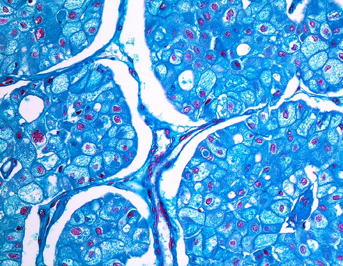 Tumor mit alveolärem Wachstumsmuster und homogener Blaufärbung des Zytoplasmas.