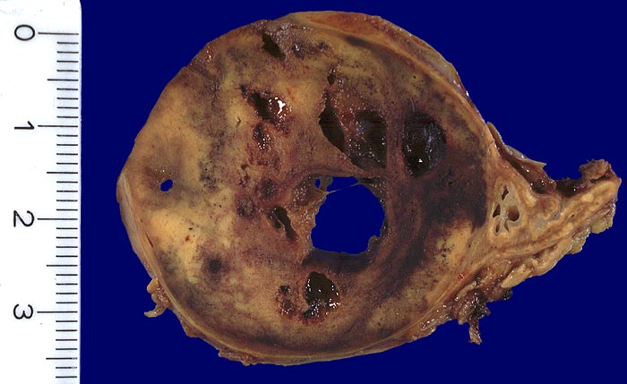Hämorrhagischer, teils zystischer Tumor ausgehend vom Nebennierenmark. (formalinfixiert)