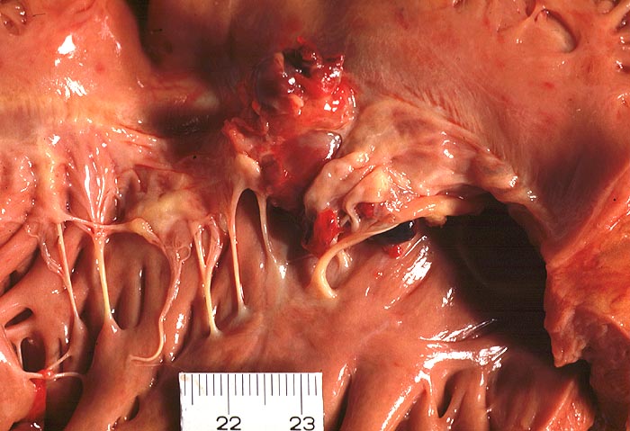 Partiell destruierte Klappensegel mit polypoiden Vegetationen.