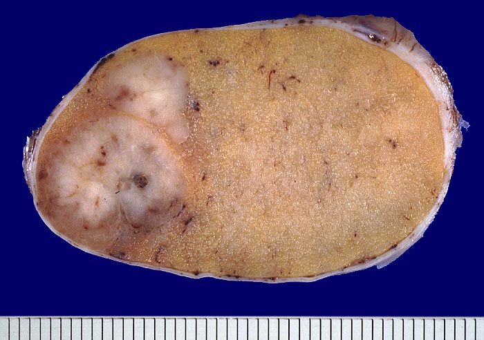 Weisser, relativ scharf begrenzter Tumor im ockerfarbenen Hodenparenchym. Makroskopischer Aspekt eines Seminoms.