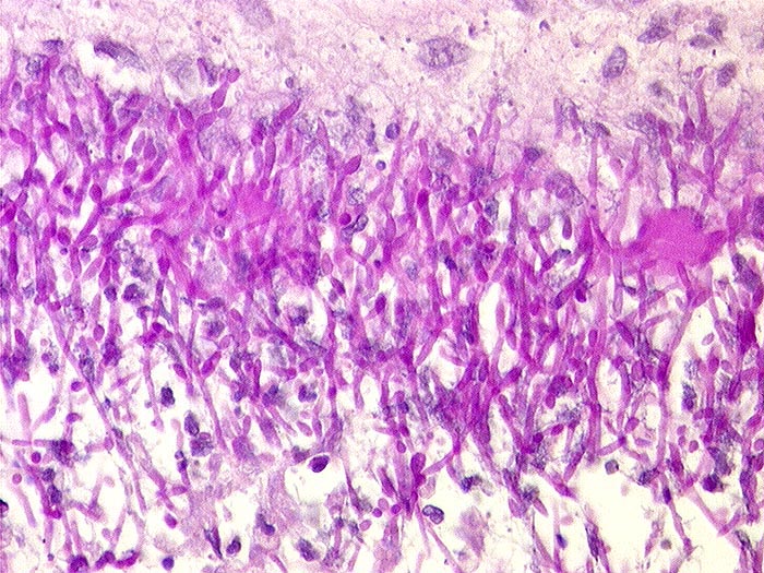PAS positive Soor Sporen (rund) und Pseudohyphen (Pilzfäden ohne echte Verzweigungen).