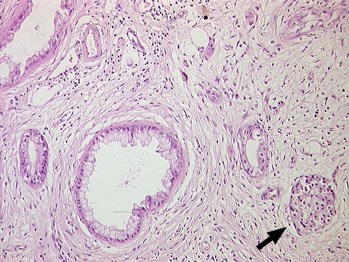 Im desmoplastischen Stroma liegen irregulär verstreut Drüsenschläuche mit hochprismatischem Epithel und minimalen Zellatypien. Vom normalen Pankreasparenchym sind lediglich einzelne ► Inseln übriggeblieben.