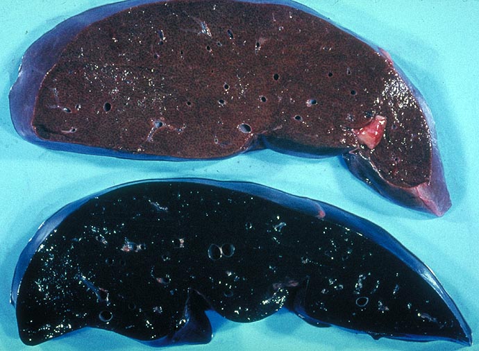Schwarzverfärbung der Leber wegen Lipofuszinose nach jahrzehntelangem Phenacetinabusus. Oben Vergleichsleber mit subakuter Stauung.