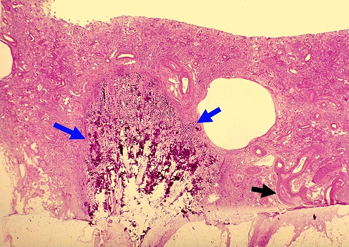Hochgradig geschrumpfte Nierenrinde. Die Tubuli sind vollständig atroph. Die gesamte ► nekrotische Papille ist in situ verblieben verkalkt und verknöchert. Die Gefässe zeigen eine ausgeprägte ► adaptative Intimafibrose.