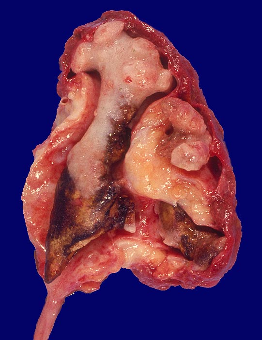 Hirschgeweihartiger Nierenbeckenausgussstein. Hochgradige Ausweitung des Nierenbeckens und Schrumpfung des Nierenparenchyms. Die Nierenoberfläche grob gebuckelt infolge rezidivierter Pyelonephritis. Nierenbeckenschleimhaut gerötet.