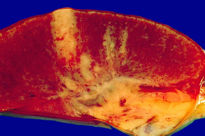 Nierenschnittfläche: Mehrere Eiterstrassen durchziehen das Nierenparenchym von der Kapsel bis zur Papille.