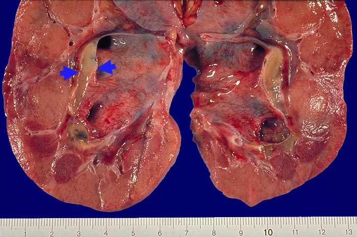 Die Nierenbeckenschleimhaut zeigt eine massive Gefässinjektion. Zwischen Nierenparenchym und Nierenbeckenschleimhaut ist im subpelvinen Fettgewebe ein ► Eiterband erkennbar. Im Nierenparenchym nur kleinste akute pyelonephritische Herde.