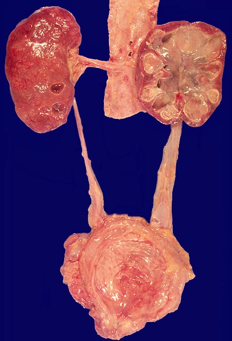 Im Vergleich zur kontralateralen Seite ist der Ureter ausgeweitet. Auch das Nierenbecken ist dilatiert. Die Niere wird durch grosse rundliche Nekroseherde weitgehend zerstört.