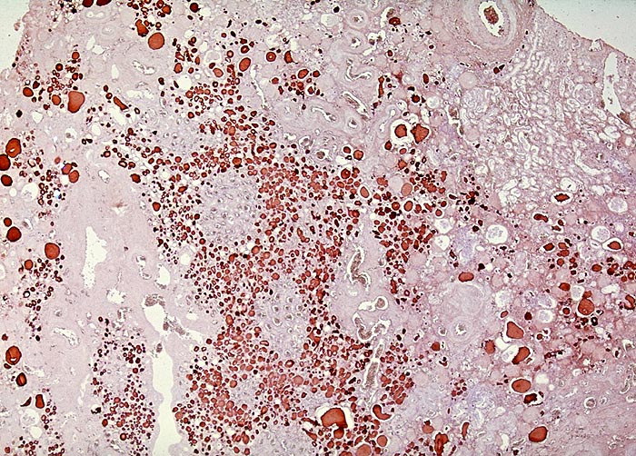 Pseudostrumaherd mit dilatierten Tubuli gefüllt mit Harnmukoid. Die Harnmukoidzylinder enthalten massenhaft IgA.