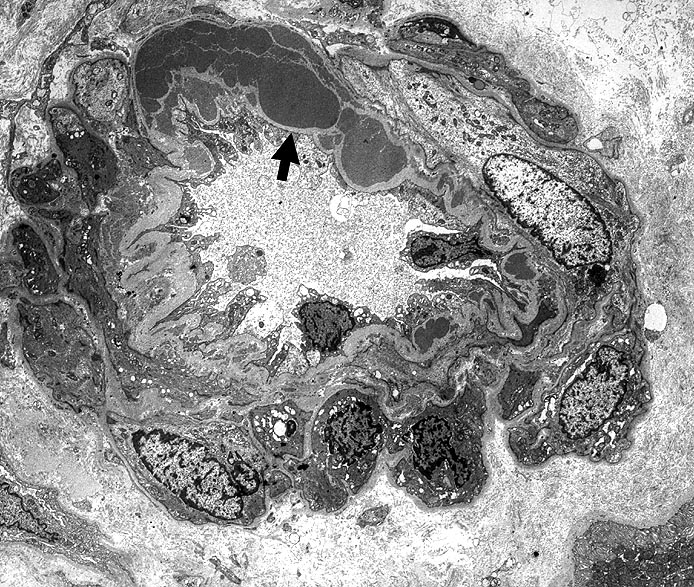 Typisch für Diabetes mellitus ist der Befall von Vas afferens und efferens, oft auch der Vasa recta. In intrarenalen Arterien unspezifische Atherosklerose teilweise mit Atheromen (typisch für Diabetes). Der Schweregrad korreliert im allgemeinen mit dem Ausmass der exsudativen Läsionen der Glomerulosklerose. Die Arteriolosklerose im Vas afferens beim Diabetes ist identisch mit der Arteriolosklerose bei arterieller Hypertonie.