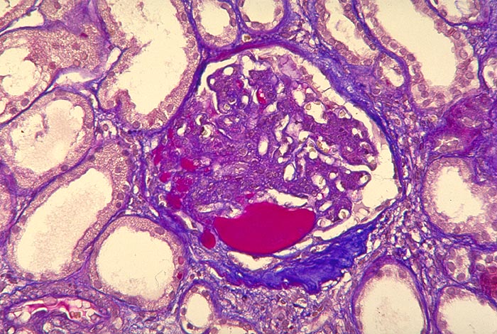 Diffuse Glomerulosklerose mit segmentaler Sklerose (Exsudative Läsion): fingerförmige Verbreiterung des Mesangiums mit Matrixvermehrung ohne begleitende Zellvermehrung. Einzelne periphere Schlingen werden durch teilweise riesige Proteinthromben vollständig ausgefüllt. In diesen Bereichen Synechie mit der Bowman' Kapsel. Die übrigen Schlingen mit teilweise weit offenen Lumina.