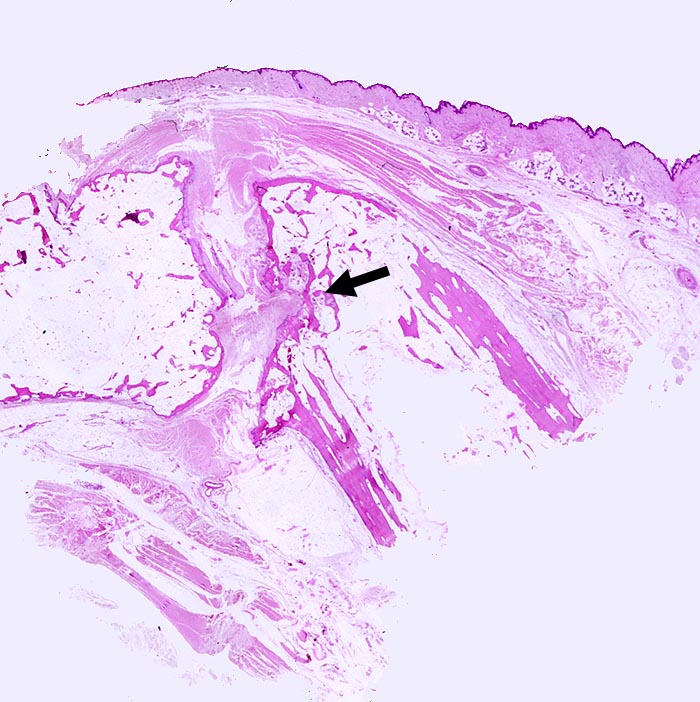 Interphalangealgelenk mit sehr unregelmässiger Gelenkfläche und praktisch fehlendem Knorpel. Im Gelenkspalt bindegewebiger Pannus. Dieser zerstört ► an einer Stelle die Gelenkfläche und dringt in die Spongiosa ein.