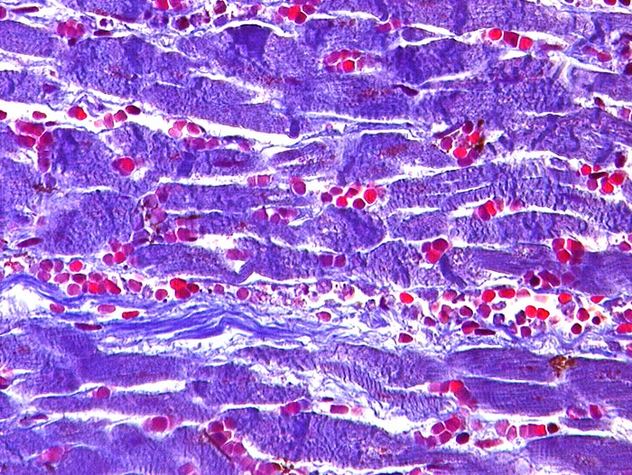 Nekrotische Myokardfasern mit zahlreichen Kontraktionsbändern. Ein granulozytäres Entzündungsinfiltrat fehlt.