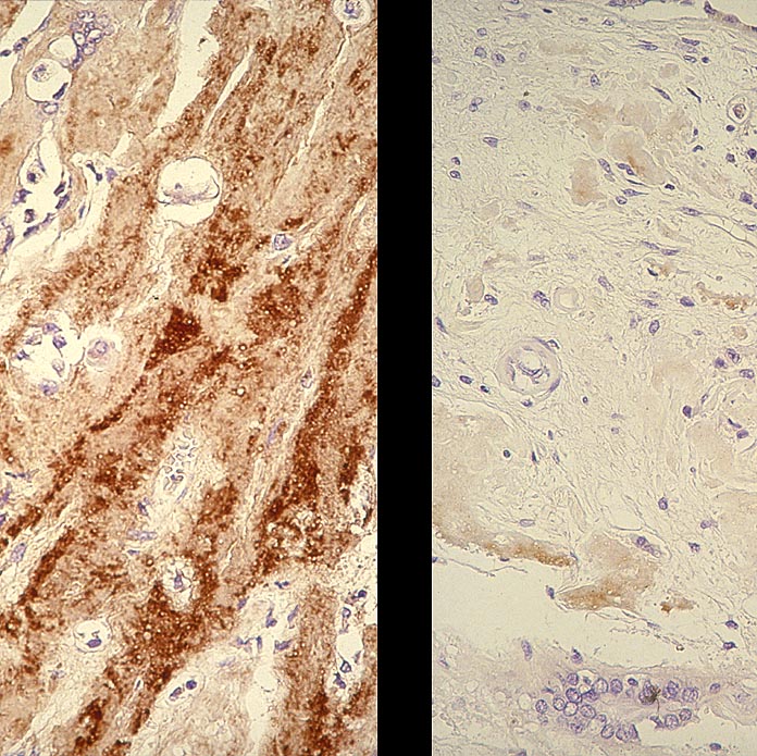 Interstitielle peritubuläre Ablagerungen von AL-Amyloid (links). Die Inkubation mit AA-Amyloid ist negativ (rechts).