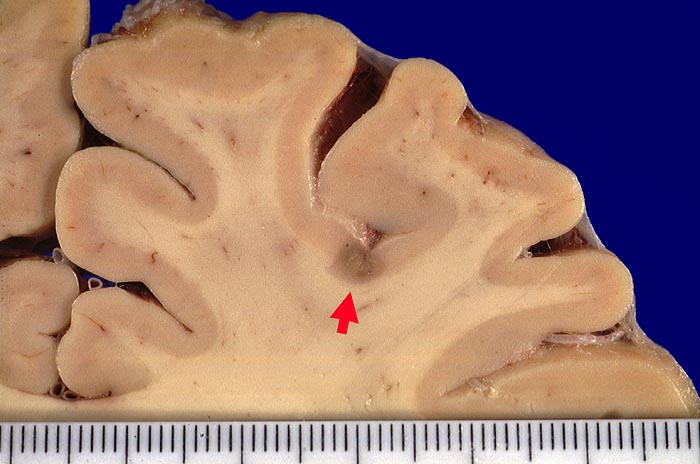Brauner runder ► Nekroseherd an der Mark-Rindengrenze im Bereich eines embolisch verschlossenen Gefässes.
