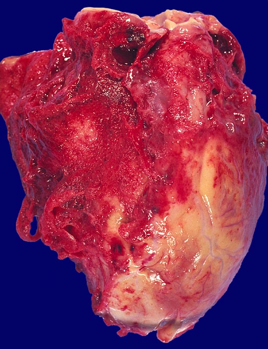 Das Epikard ist bedeckt von einem dicken Fibrinfilz.
