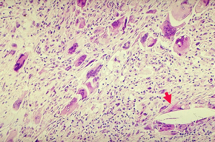 Ausschnitt aus dem Granulationsgewebesaum. Hier finden sich massenhaft Riesenzellen vom Fremdkörpertyp. Dazwischen ein gemischtzelliges entzündliches Infiltrat. Typischerweise sind auch ► Fremdkörpergranulome in der Umgebung von Cholesterinkristallen anzutreffen.