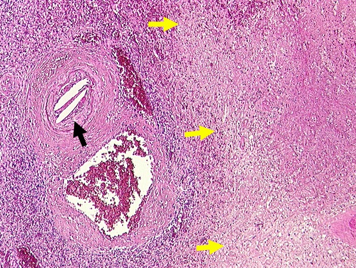 Durch die Fixation herausgelöste Cholesterinkristalle sind als wetzsteinförmige Hohlräume im Gefässlumen sichtbar. Frischer Milzinfarkt.