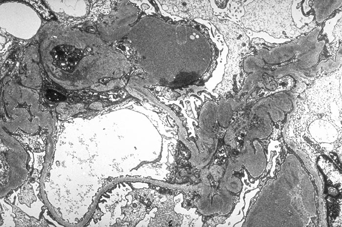 Massive überwiegend mesangiale Depots. Die peripheren Glomerulusschlingen sind wenig verändert.