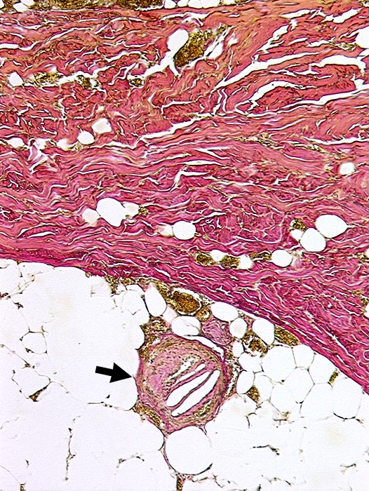 Organisierte wetzsteinförmige ► Cholesterinkristalle in subkutaner Arterie.