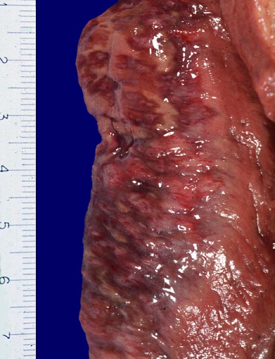Blick auf die Schnittfläche der linken Herzkammer. Auf diesem Bild ist vor allem der rote Granulationsgewebssaum gut erkennbar, welcher das dazwischen gelegene erhabene gelb verfärbte nekrotische Gewebe organisiert.
