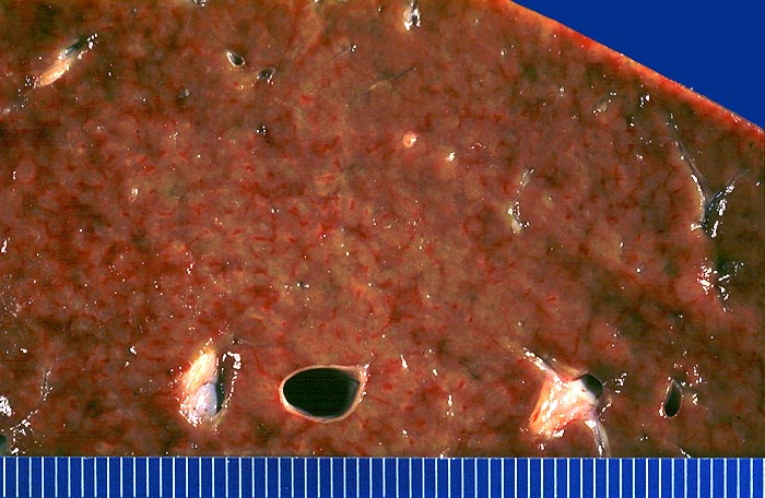 Die perivenulären Koagulationsnekrosen sind aufgrund einer zusätzlich zur Minderperfusion bestehenden rechtskardialen Stauung blutig imbibiert und erscheinen als rote eingesunkene Strassen. Das erhaltene Parenchym rund um die Portalfelder ist gelb und erhaben.