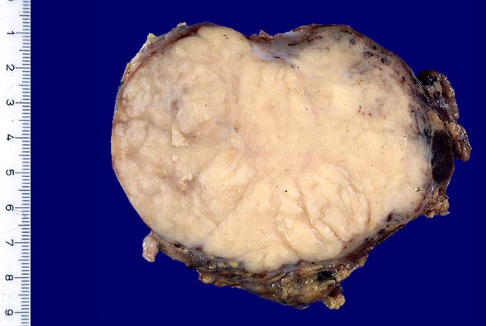Weitgehend amelanotische knotige Metastase. Kleine pigmentierte Areale im Randbereich.
