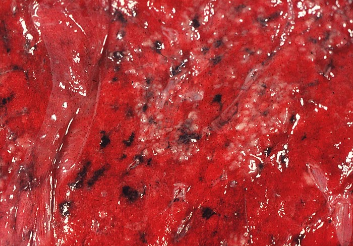 Im Parenchym finden sich weisse knötchenförmige Infiltrate.
