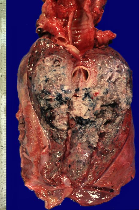 Grosse zentral um den Hauptbronchus gelegene grauweisse zerfallende unscharf begrenzte Tumormasse.