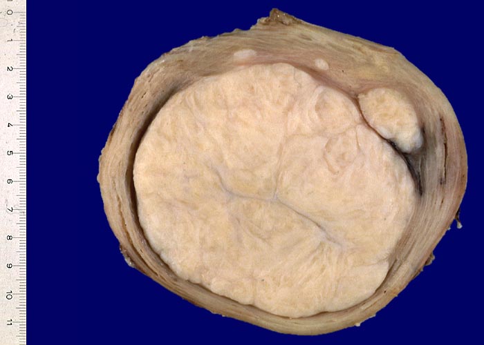 Im Myometrium gelegene scharf begrenzte weisse Knoten mit wirbliger Schnittfläche.