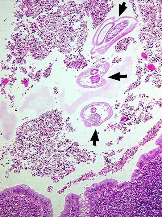 Nematode. Darmparasit im Dünndarm, Kolon und Appendix. Nach oraler Aufnahme larvenhaltiger Eier schlüpfen Larven im Dünndarm und entwickeln sich nach 3 Häutungen zu Adultwürmern.