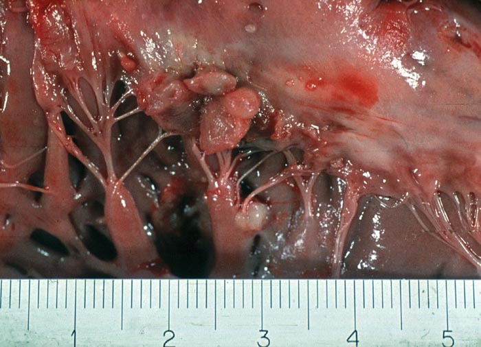Mehrere plypöse Auflagerungen am Ansatz der Papillarmuskeln am Klappengerüst.
