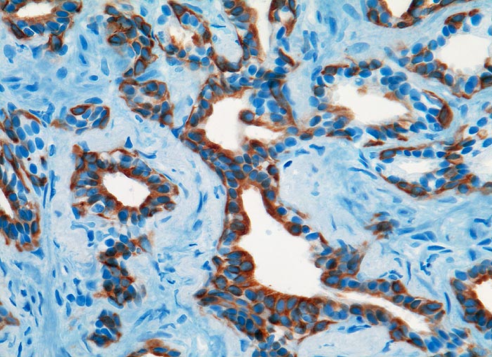 Mit dem Basalzellantikörper wird klar ersichtlich, dass es sich um eine gutartige Läsion mit erhaltener Basalzellschicht handelt. Teilweise weist auch die innere drüsenauskleidende Zellschicht Basalzelldifferenzierung auf.