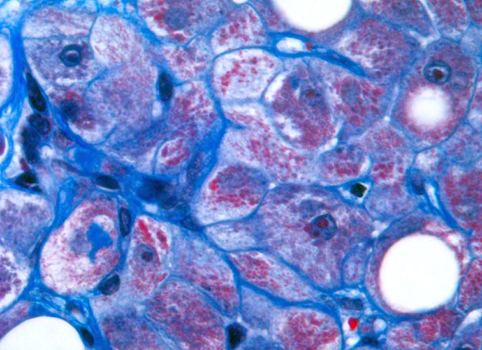 Vereinzelte Hepatozyten enthalten eine grosse Lipidvakuole. Eine hydropisch geschwollene Leberzelle enthält im Zytoplasma einen blauen amorphen Mallory-Denk Körper. Die meisten enthalten in ihrem Zytoplasma hellrote teils runde, teils lanzettförmige vergrösserte Megamitochondrien.