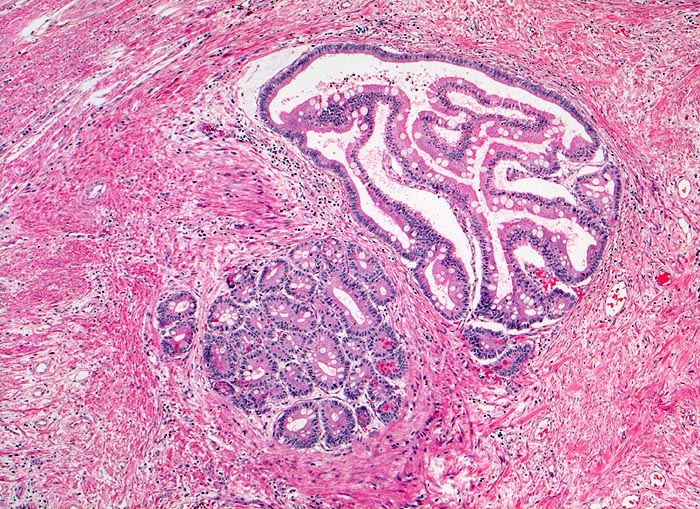 Benigne, in die Muscularis propria verlagerte Drüsenschläuche an der Polypenbasis imitieren ein invasives Karzinom. Die fehlenden Epithelatypien und der normale Epithelaufbau mit begleitender Lamina propria ermöglichen die Unterscheidung von einem Karzinom.