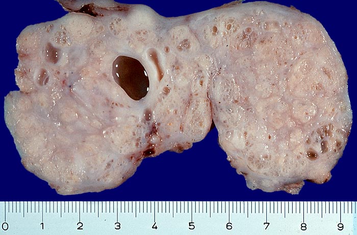 Die Schnittfläche der Prostata zeigt ein aus weissen Knoten mit feinen Zystchen (dilatierte Drüsen) aufgebautes Parenchym. Das Organ ist deutlich vergrössert.