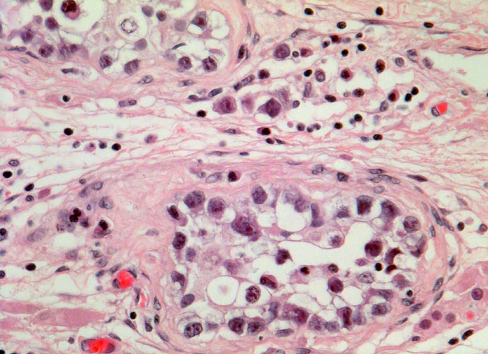 Im Interstitium lassen sich lediglich vereinzelte Seminomzellen nachweisen. Die invasiven Zellen gleichen den intratubulären atyischen Keimzellen.