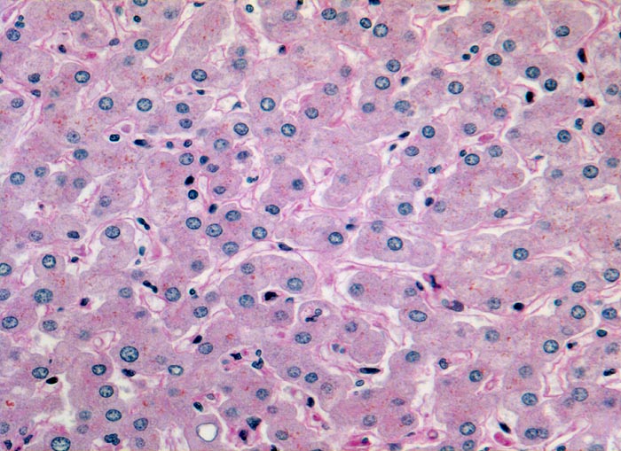 Ein- bis zweireihige Leberzellplatten. Dazwischen Sinusoide. In den Sinusoiden sind die Kerne von Endothelzellen und Kupffer'schen Sternzellen erkennbar. Das feinkörnige braune Pigment in den Hepatozyten entspricht Lipofuscinpigment.