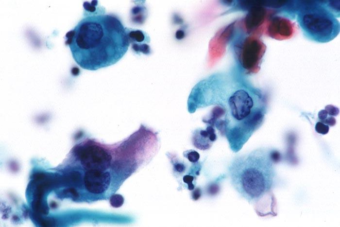Neben neutrophilen Granulozyten atypische plattenepitheliale Zellen. Besonders auffallend ist der stark geschwänzte und teilweise bizarre, hochgradig keratinisierte Zytoplasmaleib. Die Kerne dagegen sind nur mässig gross, dabei aber ebenfalls deutlich atypisch.