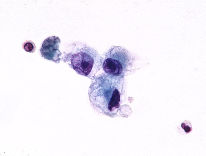 Relativ grossleibige Zellen mit grobstrukturierten Kernen und auffallend plumpen Nukleolen. Der Zytoplasmaleib der atypischen Zellen ist schaumig strukturiert.