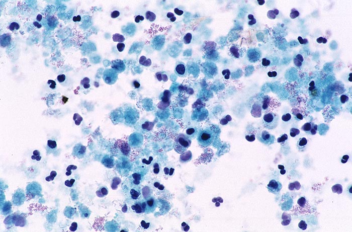 Der Hintergrund ist stark detritisch und enthält viele Granulozyten, Bakterien und Schleim. Immer wieder erkennt man degenerierte Zylinderepithelzellen.