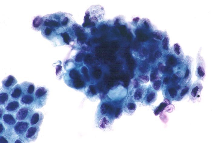 Urothelien in lockeren Verbänden. Die Epithelien besitzen relativ grosse, teils entrundete und deutlich grob strukturierte hyperchromatische Kerne. Der Zytoplasmaleib ist uncharakteristisch zyanophil oder leicht aufgelockert. Hin und wieder auch ziemlich grosse und stark atypische Kerne.
